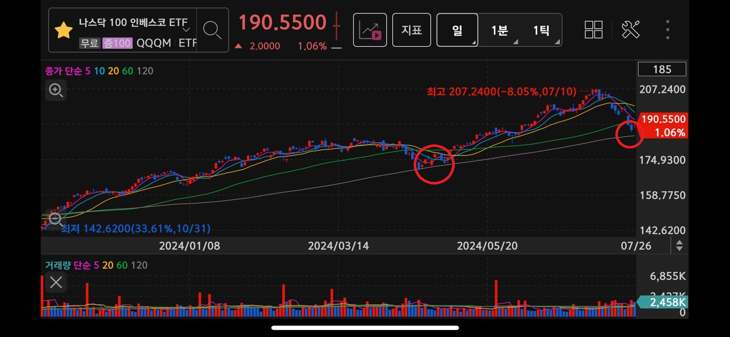 만약 QQQM의 120선이 무너진다면 한동안 여유자금을 달러로 환전만 시켜놓고 지켜볼 생각이다.